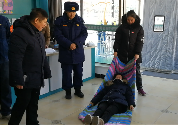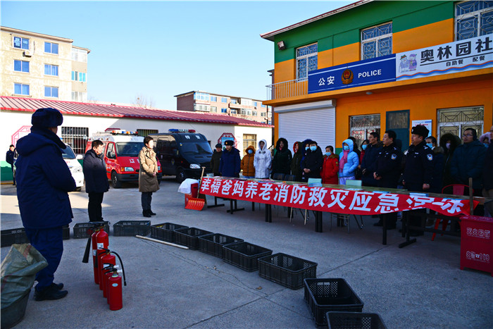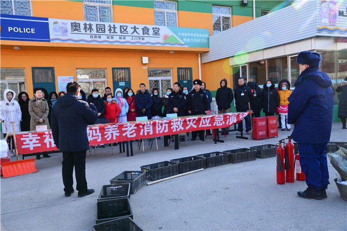 2019.1.15日上午,辽阳市幸福爸妈养老服务发展中心各分支机构人员集中到奥林园社区养老服务驿站,进行了一次*********实战安全消防救灾技能演练。宏伟区民政局长包局长包洪英、光华派出所教导员吕强、副所长刚占鹏、消防队徐队和奥林园社区领导和相关人员共50多人参加了这次演练活动。