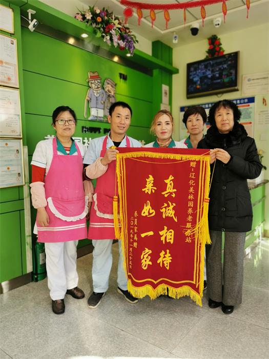 幸福爸妈养老服务发展中心美丽园社区养老服务站李凤珍家属,为感谢养老机构的热心服务,为美林园养老服务站送锦旗“真诚相待亲如一家”。