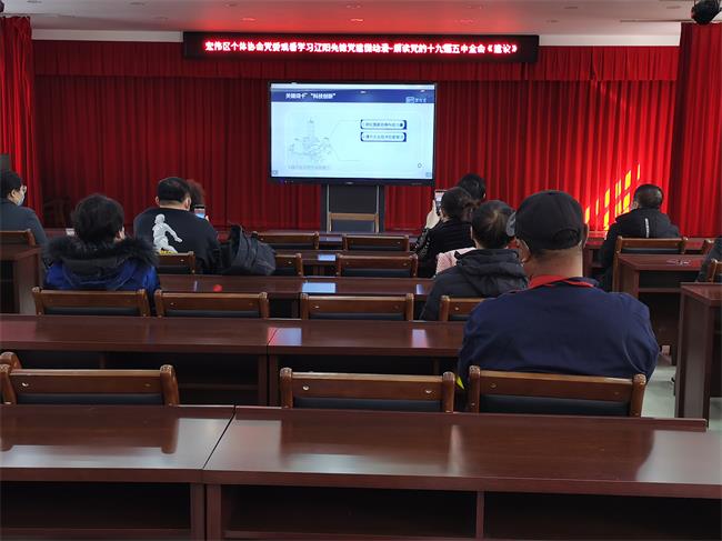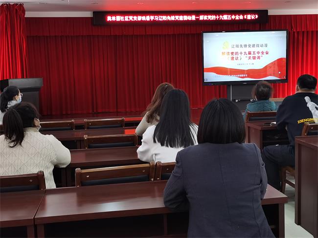 2021.3.5下午2.00宏伟区个体协会委员会下属各个党支部书记、奥林园社区全体党员、幸福爸妈养老服务发展中心党支部全体党员联合在一起观看了辽阳先锋教育网《解读党的十九届五中全会(建议)关键词上、中、下三集视频。