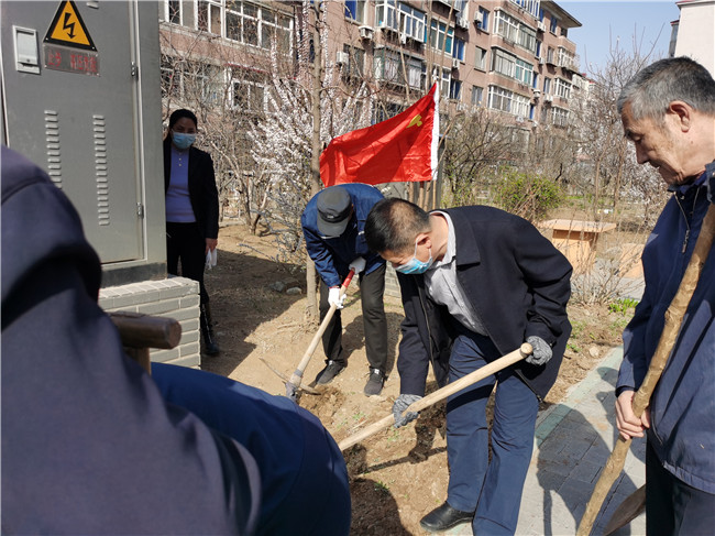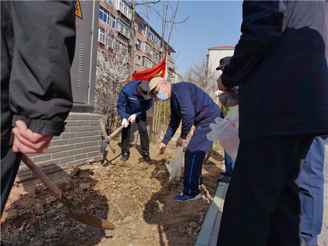 党课后,党员们参加了社区的栽花种草活动,为社区的绿化做义务劳动。