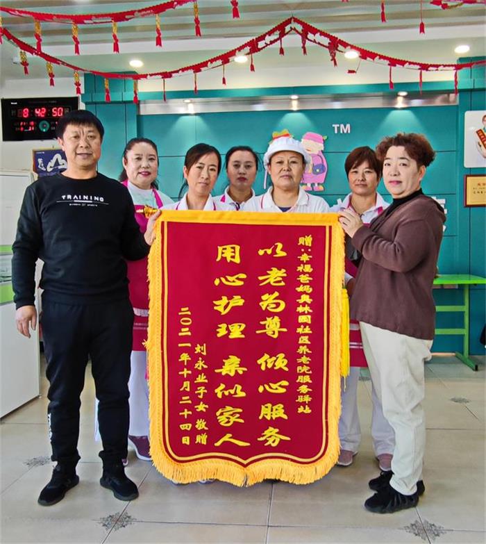 2021.11.1幸福爸妈养老服务发展中心奥林园社区养老服务驿站养员刘永业子女,为感谢养老院的热情服务、精心呵护老父亲,特为奥林园养老服务驿站送礼来了锦旗。“以老为尊 倾心服务 用心护理 亲失家人”,对幸福爸妈奥林园的养老服务工作给以高度评价。