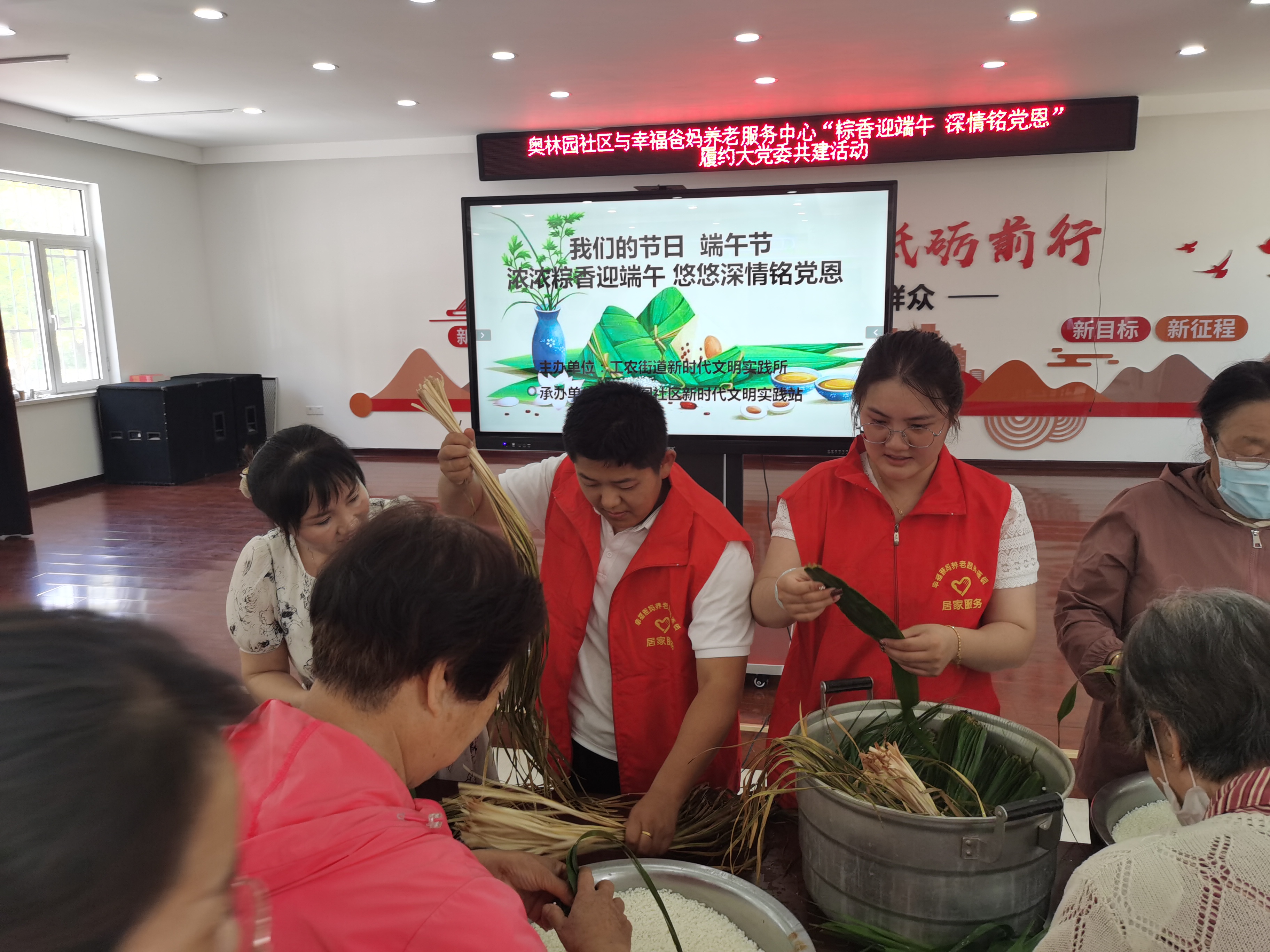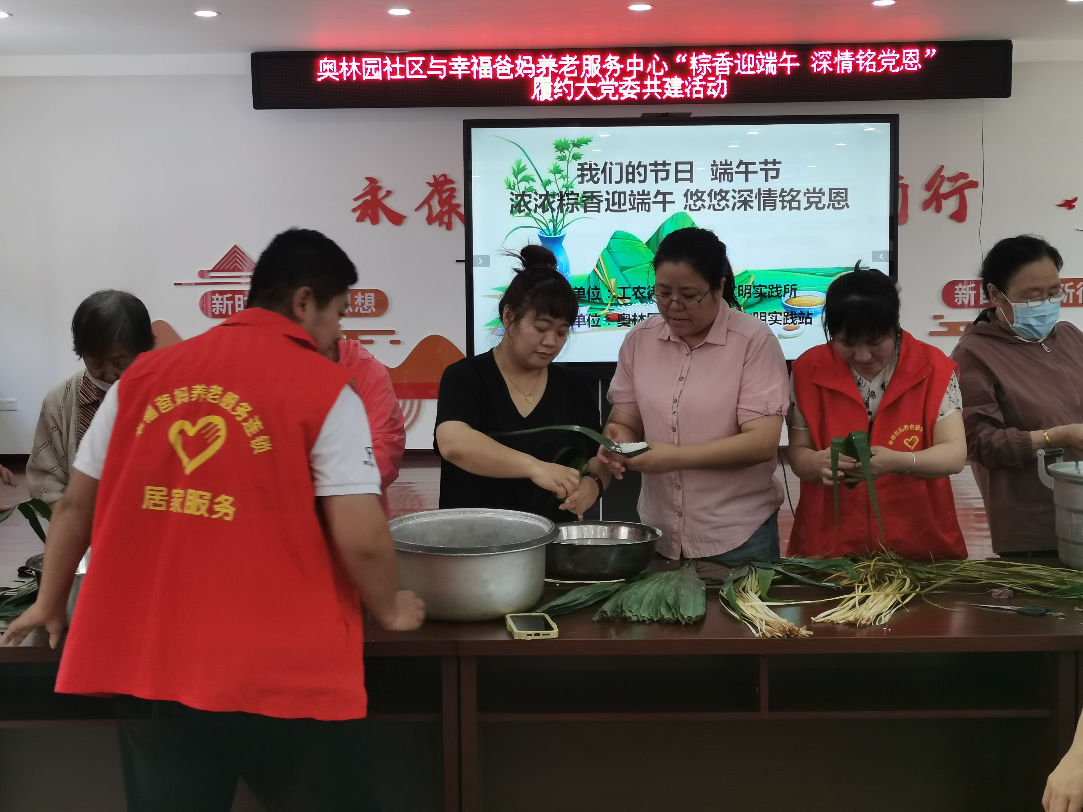 奥林园社区与幸福爸妈养老服务发展中心“棕香迎端午 深情铭党恩”履约大党委共建活动,为社区的贫困户和贫困党员包粽子、送鸭蛋等。幸福爸妈党员为社区居民捐物过节千余元。
