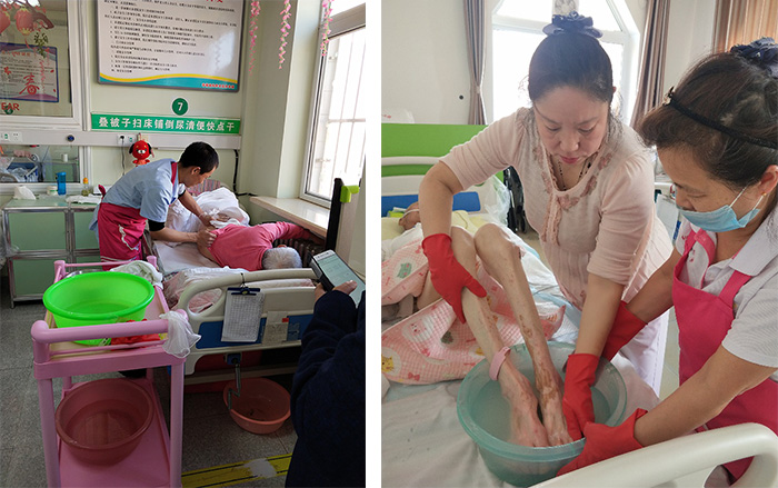 3、坚持每天为不能下床的老人擦洗,为能下床的老人洗澡,特别是夏天,随时随的清洗便溺的身体,及时更换衣服,保持身体清洁无异味。