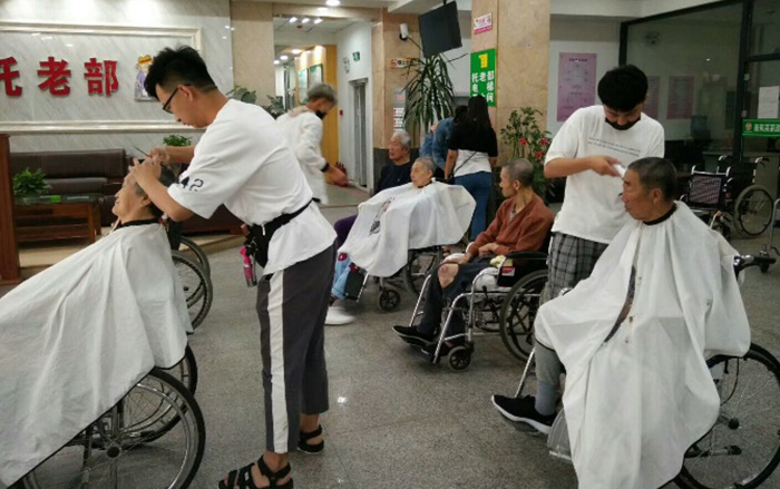6、在院长的带领下,大家都为老人义务及时的理发,让老人感受到家一样的温暖。