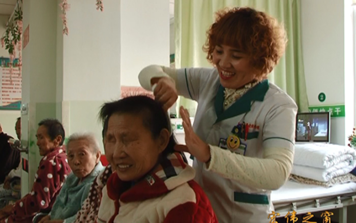 院长亲自为老人梳头发
